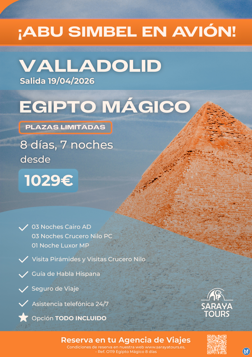 Exclusivo! Egipto Mágico con Abu Simbel en Avión Salida Valladolid 19/04/26 Plazas Limitadas